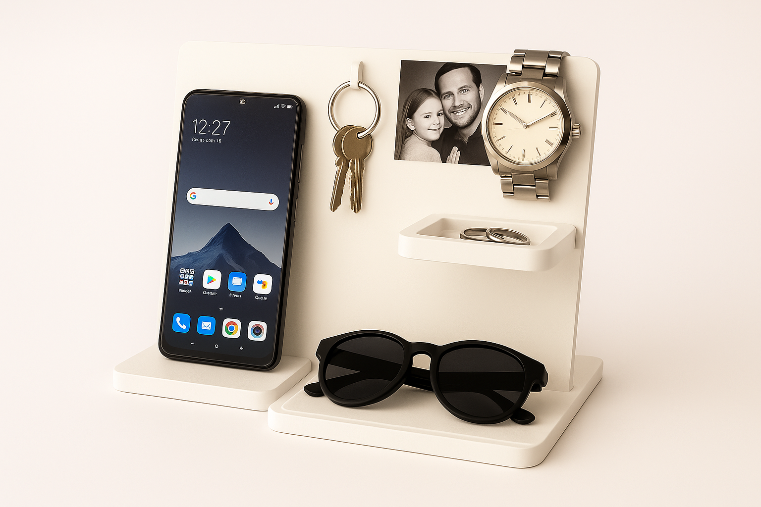 Incluye ranura para sostener el telefono, gafas, anillos, llaves, reloj y foto personalizada.