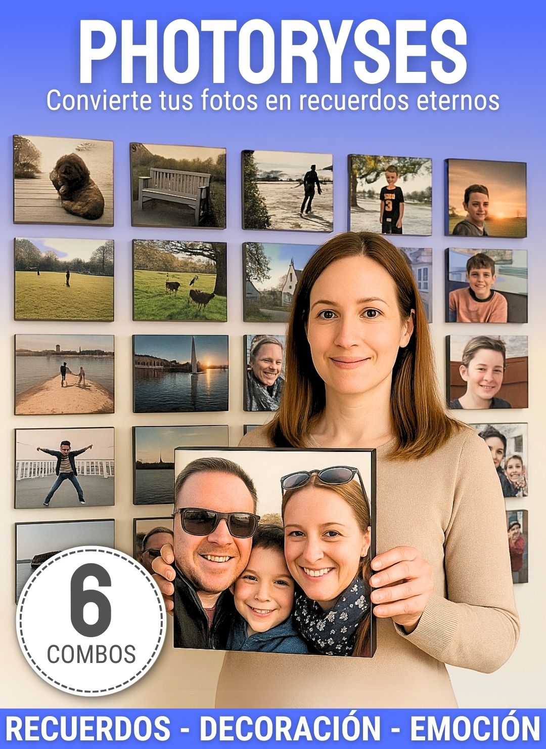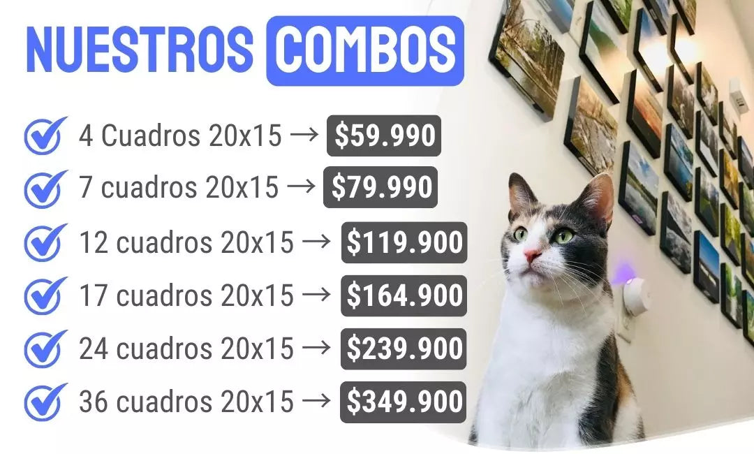 Cada combo incluye cuadros de 20x15 cm con tus fotos favoritas, listos para decorar.